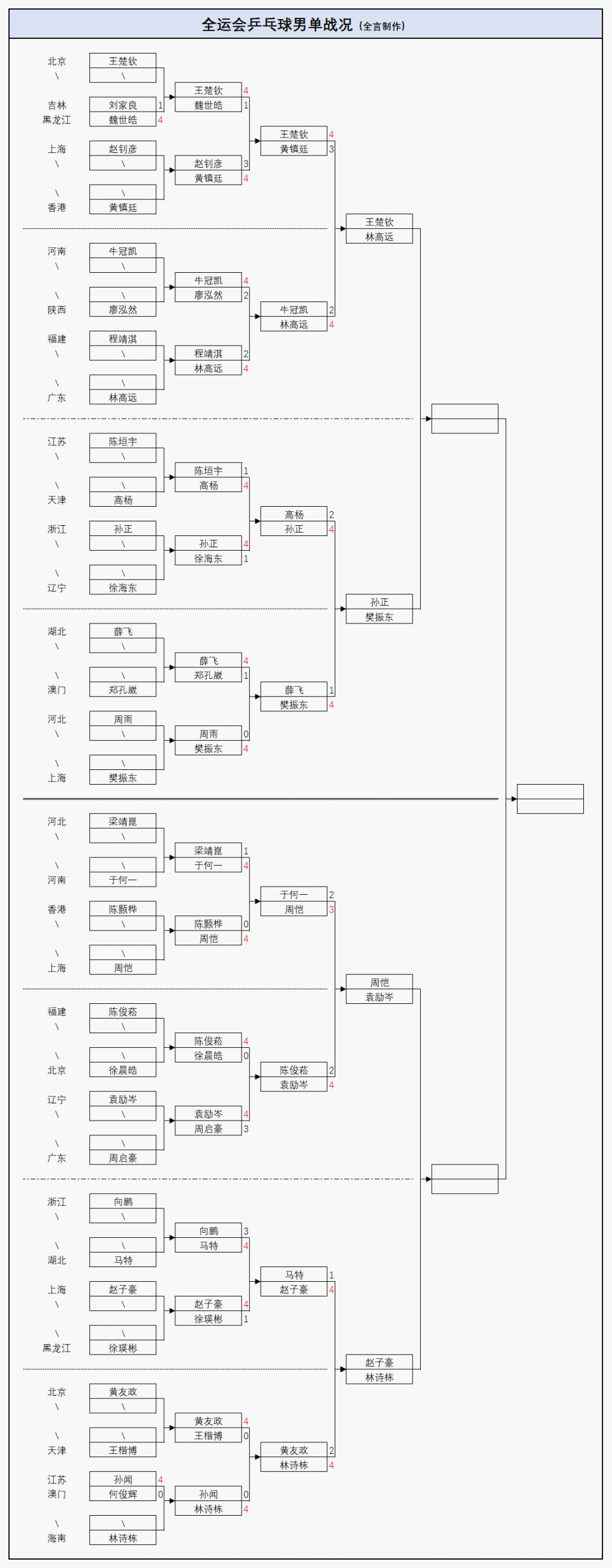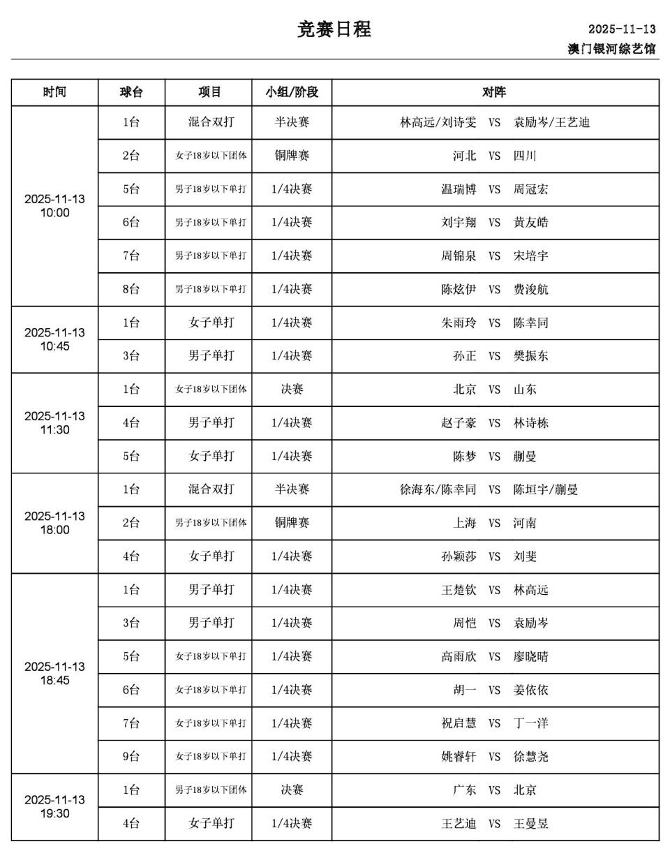 18:45,王楚钦(北京)VS林高远(广东)、周恺(上海)VS袁励岑(辽宁);