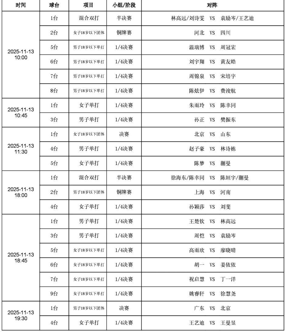 2025年11月13日,全运会乒乓球项目来到第七个比赛日,青少年组将诞生两个团体冠军,成人组决出单打四强和混双决赛席位,国乒部分主力交手,多达12人拥有世界冠军头衔,竞争更激烈。