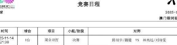 晚间21点混合双打铜牌赛。徐海东/陈幸同VS袁励岑/王艺迪