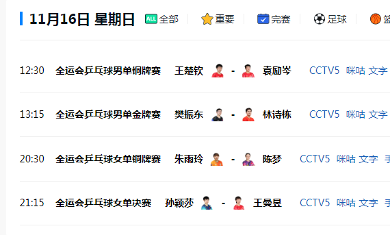 全运会乒乓球单打比赛,铜牌赛和决赛将在今日进行,感谢央视,CCTV5将全程直播这4场比赛。比赛时间确定了,12:30,王楚钦VS袁励岑,争夺男单铜牌;13:15,樊振东vs林诗栋,争夺男单冠军;20:30,朱雨玲VS陈梦,争夺女单铜牌;21:15,孙颖莎VS王曼昱,争夺女单冠军。