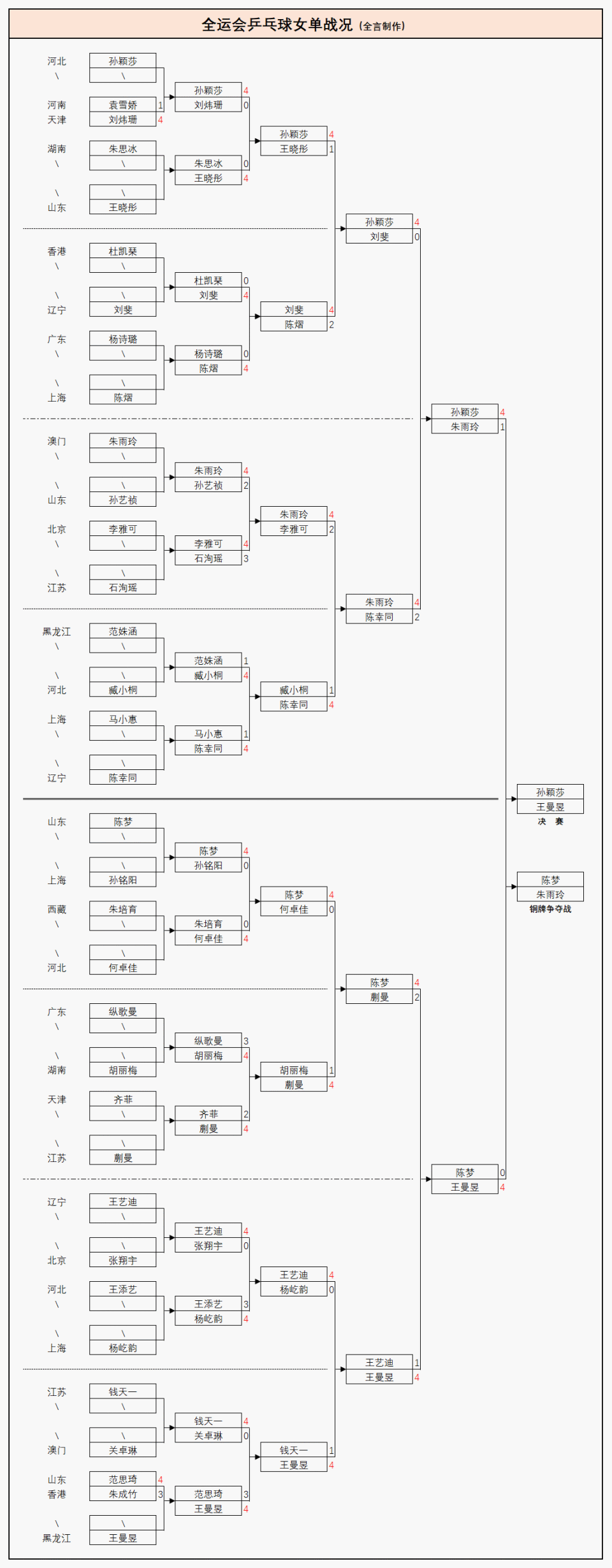 朱雨玲:4-2孙艺祯(山东)、4-2李雅可(北京)、4-2陈幸同(辽宁),1-4孙颖莎(河北)。