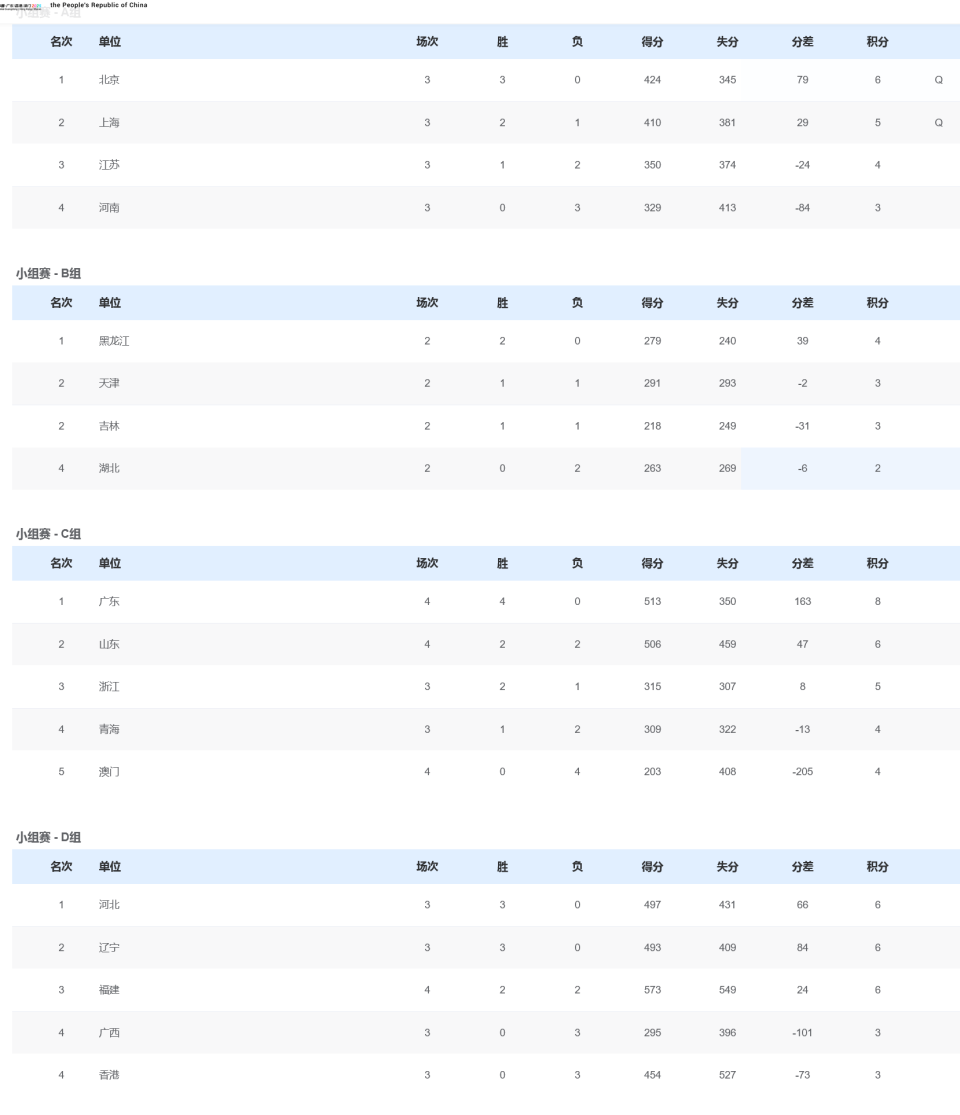 至此,A组赛程全部战罢,北京队豪取3连胜排名第一晋级,上海队2胜1负排名第二晋级。此外,江苏队关键战失利被淘汰,而河南队遭3连败垫底出局。