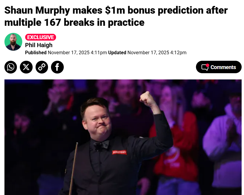 近日,魔术师墨菲在接受英媒《地铁报》的采访中声称:本届利雅得锦标赛,会有球员打出167满分,自己也有信心打出167满分。
