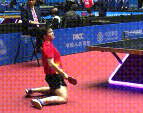 另外,在抽球的时候,樊振东没有站稳,不慎双膝跪倒在地。接下来的一幕让人无比吃惊:跪倒在地的樊振东,没有借助任何外界力量,直接从地面弹了起来。注意,是真的弹了起来,他的身体有一个明显前冲的动作。