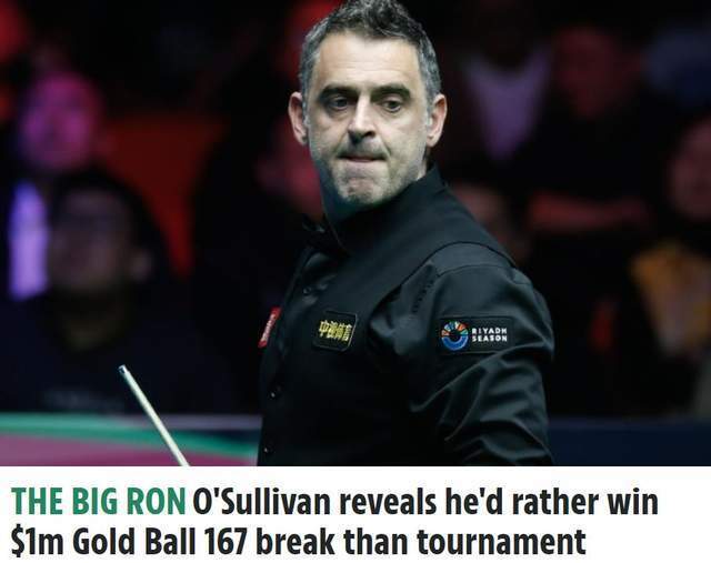 英国媒体太阳报报道,奥沙利文表示,自己宁愿拿到167分的100万美元奖金,而不是拿到利雅得狂欢季锦标赛的冠军。奥沙利文强调,对于所有斯诺克球员的最大考验,就是能否抓住打入金球的机会。