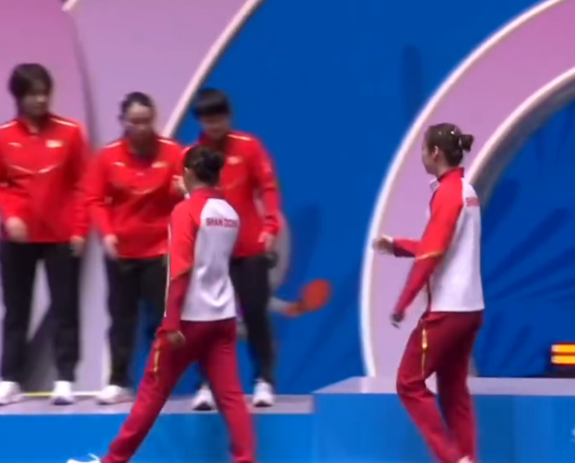 其中陈梦和王晓彤搭档双打,与何卓佳和王添艺组合,率先掀起“战火”。