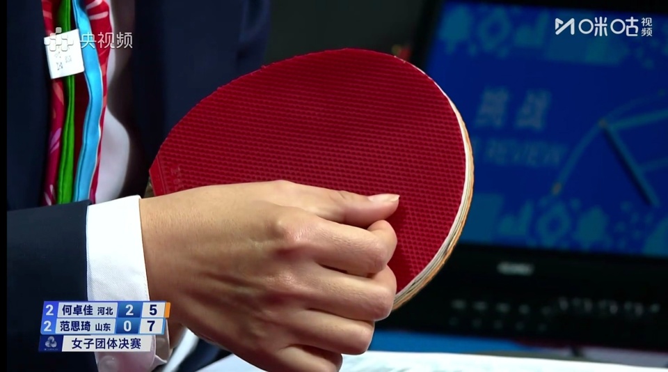 于是只能暂停了比赛将球拍拿到主裁判面前申请换球拍。