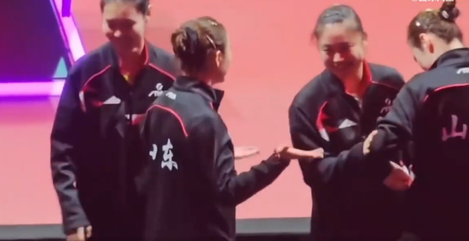决赛结束之后,山东队抱团庆祝夺冠,而现场观众、孙颖莎球迷对此结果不满,一直高喊“河北队”!