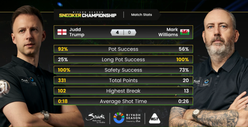世界第一特鲁姆普上场对阵马克·威廉姆斯。小特2-0开局,第3局,小特抓住老马失误,轰出一杆破百,3-0。第4局,老马简单球失误,小特接手,再添一杆破百,4-0送走老马。比赛一个小时就结束了。老马全场进球成功率只有56%。