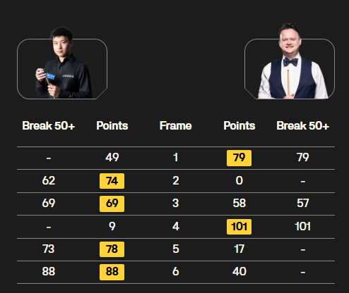 第5局,赵心童长台上手,一杆有难度的73分,3-2先到赛点。第6局,墨菲长台上手单杆40分后,传球失误。赵心童接手,一杆88分清台,4-2战胜墨菲。