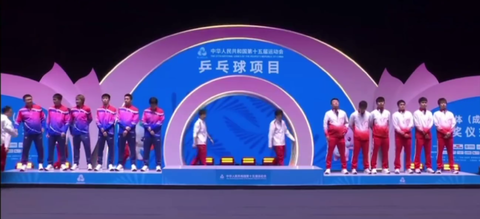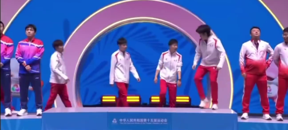 王楚钦这才意识到,其他人都还没来呢,自己这是“闯祸”了,于是赶紧一个后撤步,走下了领奖台。