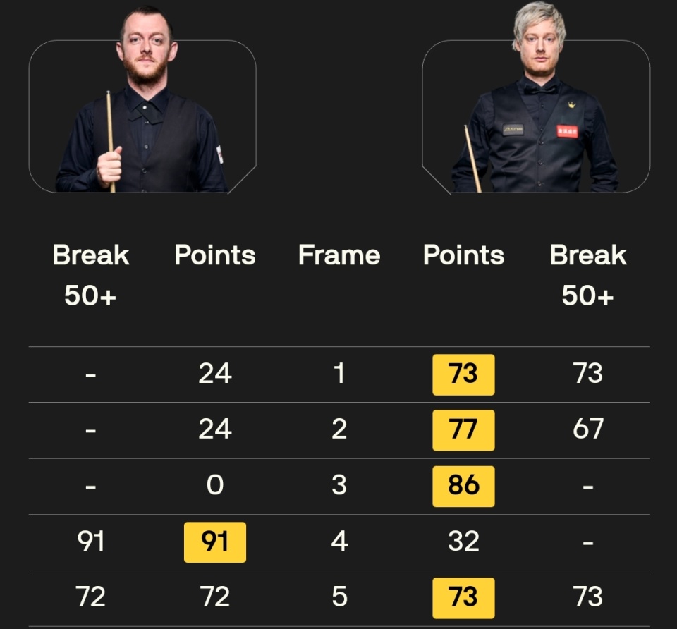 在罗伯逊和艾伦的比赛中,罗伯逊打出了强势的竞技状态。首局比赛中,艾伦率先拿到24分出现失误,随后罗伯逊单杆打出73分以73:24拿下此局成功取得1-0领先。