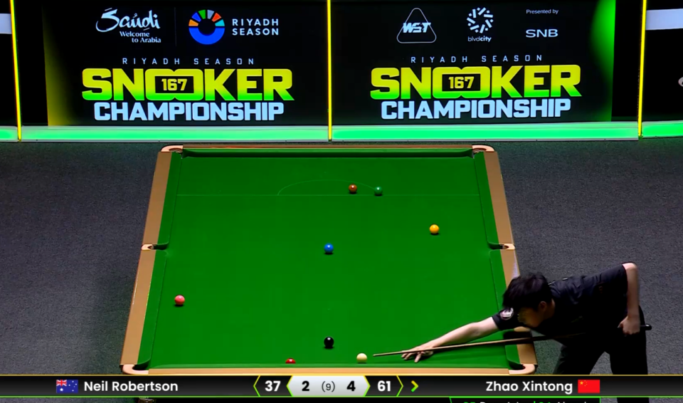 前两局,双方各胜一局。第3局,一波三折,赵心童打丢黑球后,罗伯逊打进黄球,母球摔袋,赵心童险胜拿下第3局。第4局,罗伯逊黑球失误后,赵心童一杆131分破百,3-1领先。