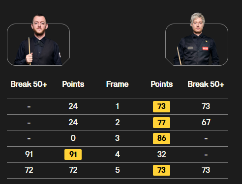 第5局,艾伦长台上手,9套红黑后,母球失位,艾伦打丢红球。罗伯逊接手,一杆73分清台,1分逆转同时,4-1淘汰艾伦,率先挺进决赛。