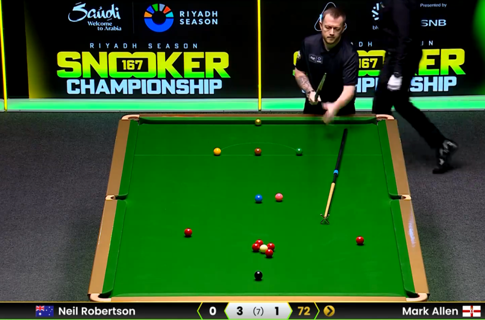 首场半决赛,澳洲火炮尼尔·罗伯逊对阵小钢炮马克·艾伦。前两局,罗伯逊都是抓住艾伦失误,打出两杆60+,2-0领先。第3局,罗伯逊两次上手,再下一城,3-0到赛点。第4局,艾伦单杆91分制胜,挽救一个赛点。