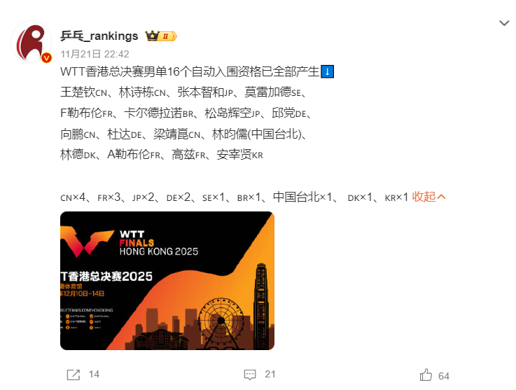 值得一提的是,WTT香港总决赛男单16个入围资格已经全部产生,中国队的王楚钦、林诗栋、向鹏、梁靖崑四人都在内,王楚钦今年还有总决赛要打。