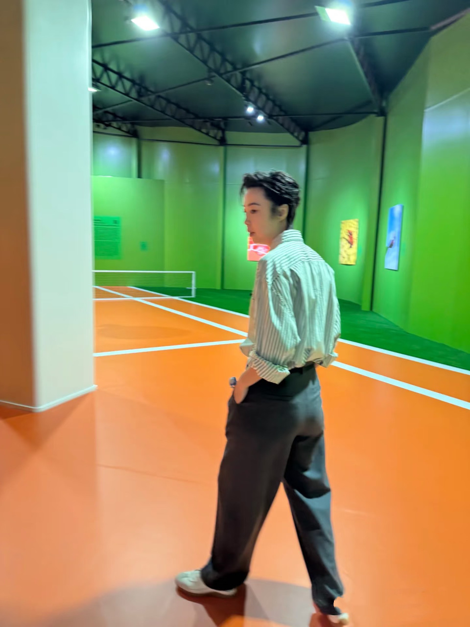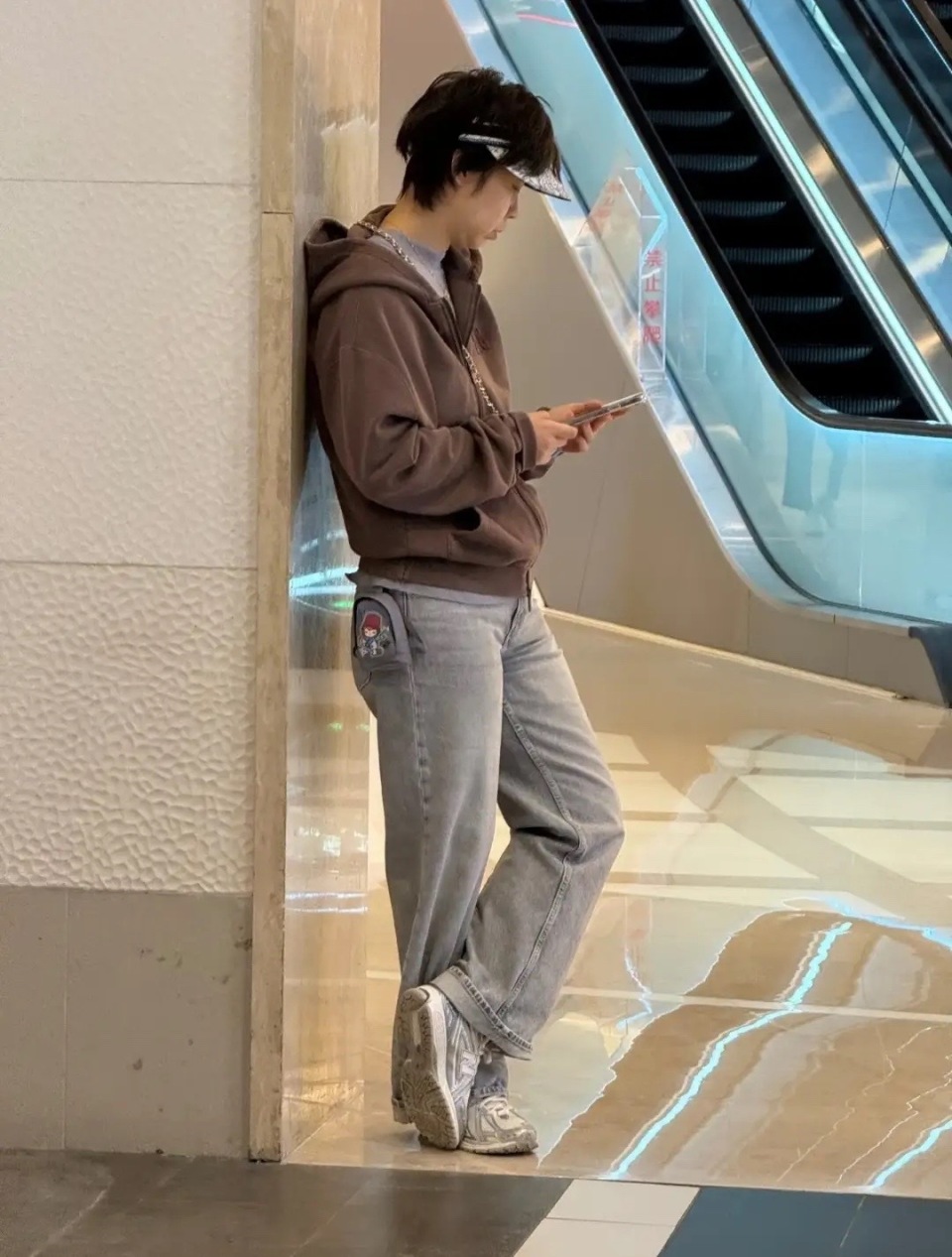 只不过她没有裹丝巾,整个人的气质就很拽很酷。张怡宁倚靠在墙面,一只腿直立着、另一只腿交叉过来,这个造型很休闲、也很随意。