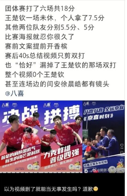 “王楚钦粉丝真的很宽容素质很高,男团海报一直弱化王楚钦都没说什么。但 40 秒的夺冠庆祝视频都没有贡献最大的王楚钦,做的太过分了 ”