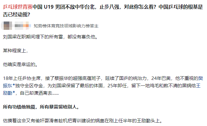 我们无意否认刘国梁与WTT之间可能存在的利益关联,也认同在他执掌国乒期间青训体系问题凸显。但将全部责任归咎于一人,是否掩盖了更深层次的结构性问题?