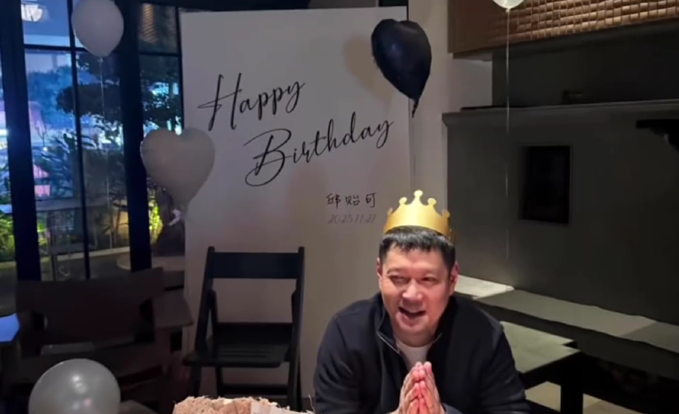 在爱人和爱徒的陪伴下庆祝这个非常有纪念意义的生日,邱贻可也是十分开心,戴着生日帽许下了生日愿望。