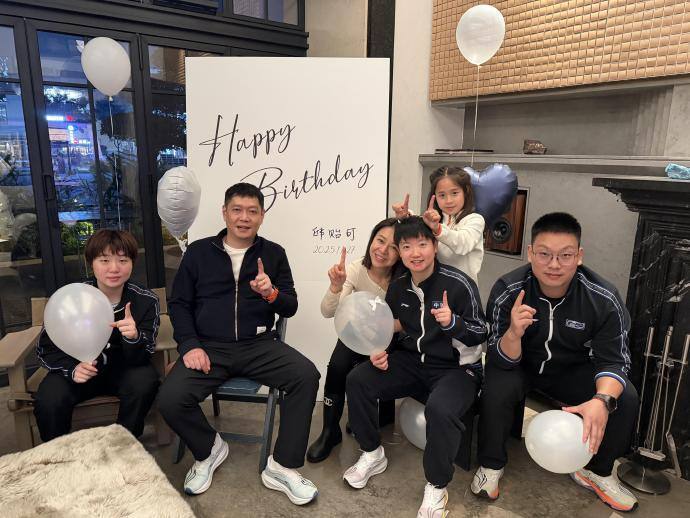 11月27日,国乒教练邱贻可在社交网站晒出自己的生日合照,照片中孙颖莎、蒯曼拿着气球,而因为比赛在成都举办,邱贻可的妻子和女儿也能够为他一起庆祝。