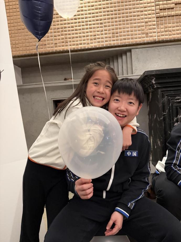 邱贻可的爱人和女儿和孙颖莎一起合影,小豌豆还在莎莎的头上比出了两个“1”,就像两个小牛角。