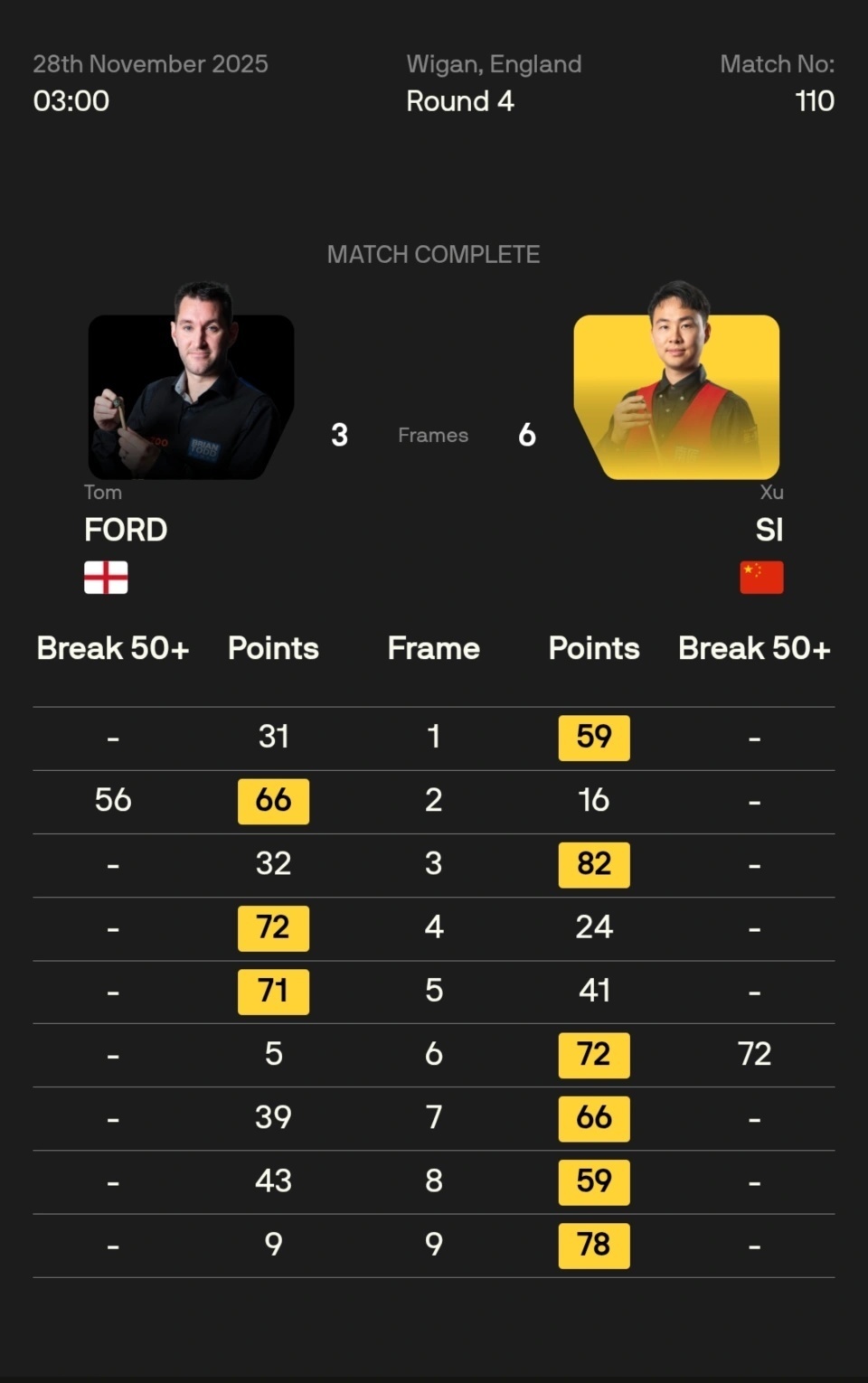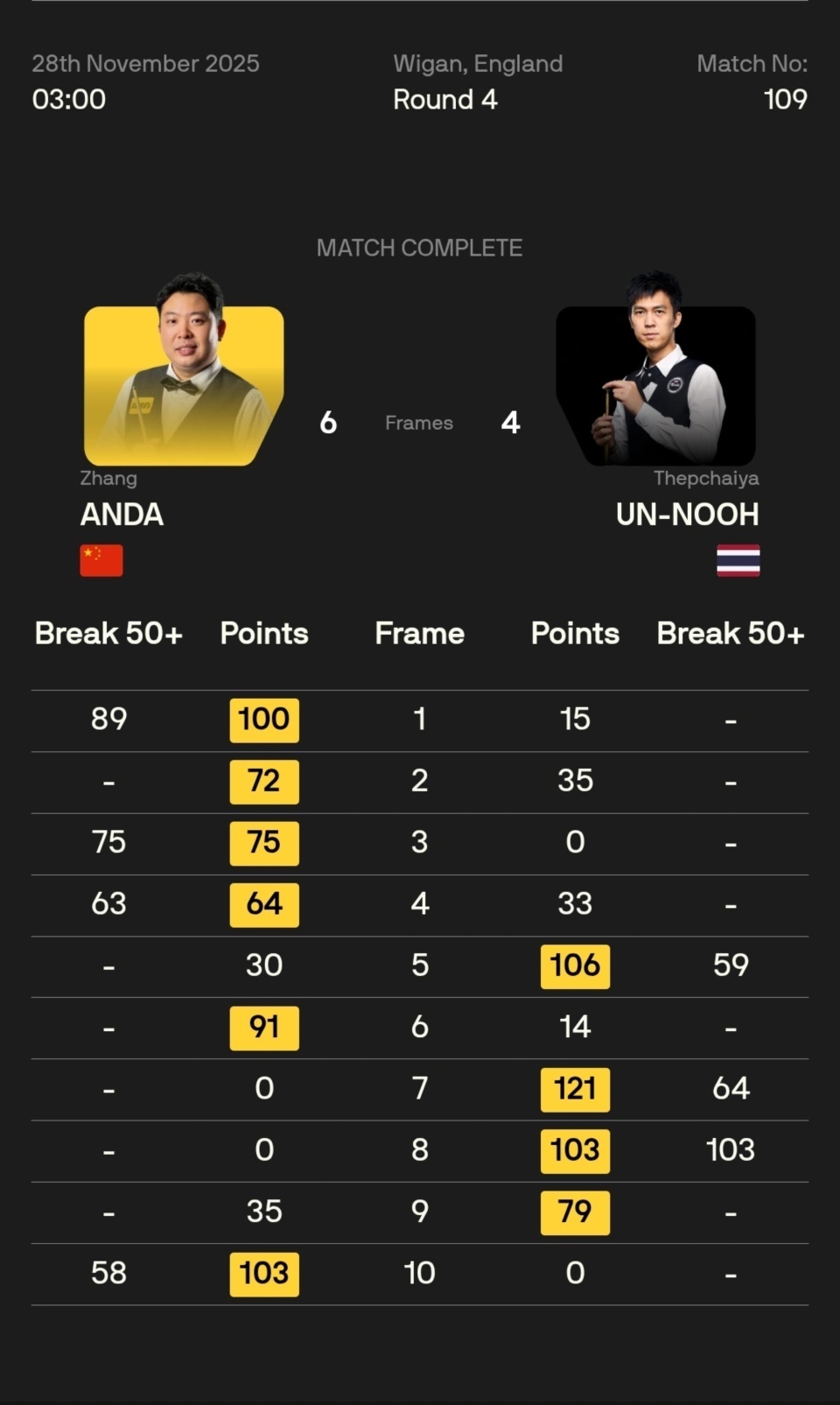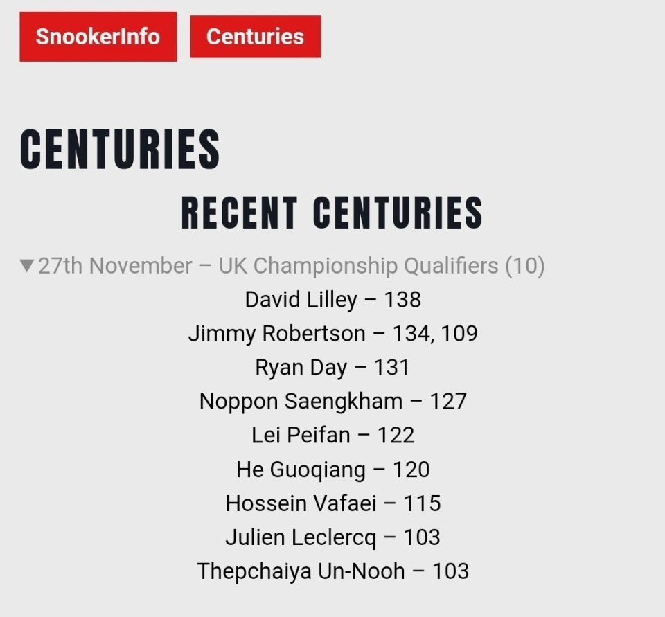 这个比赛日共打出十杆单杆过百,不过其中的六杆来自于出局的球员,吉萝卜打出两杆,国强也有一杆,本届英锦赛资格赛阶段共完成83杆破百,其中常冰玉和利亚姆·普伦完成了各自的首杆147。