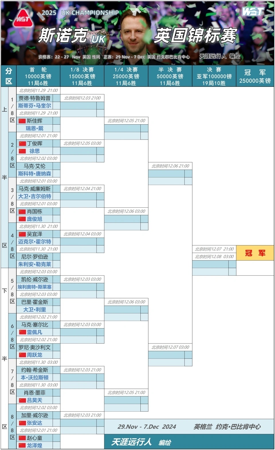 最新2025斯诺克英国锦标赛正赛进程签表,且称全网第二吧。一表看英锦赛正赛全程的赛程战报,各位看官老师请转发收藏,以备不时之需。