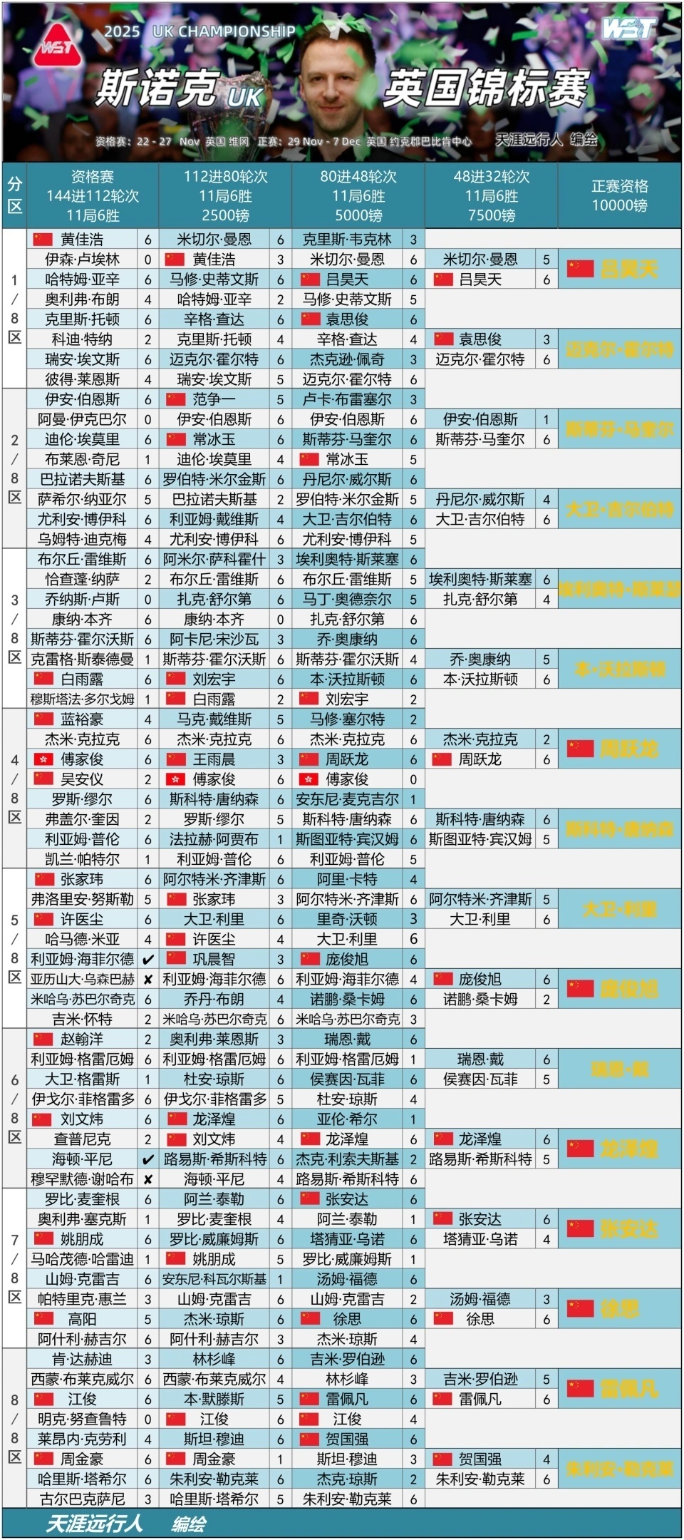 出战英国锦标赛正赛首轮的12位中国球员,抽到三场德比,为中国军团提前锁定了三席16强的席位。另外的六场外战,一起为中国球员加油!