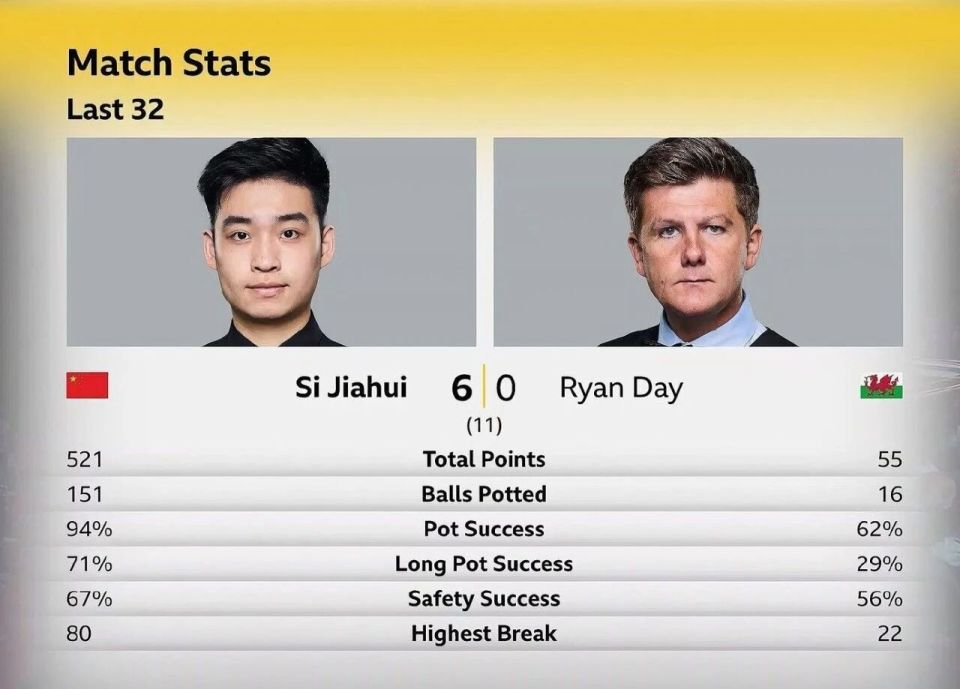 短休后,瑞恩·戴依然不停送机会,斯佳辉拿下第5局后,第6局两次上手,完成超分,6-0横扫晋级。