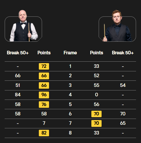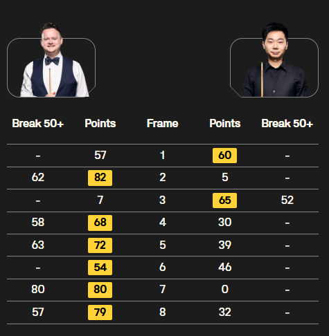 凌晨场,巫师希金斯对阵沃拉斯顿,希金斯打出4杆50+,5-0到赛点。眼看胜利在望,第6局,希金斯单杆58分,被沃拉斯顿一杆70分清台逆转。沃拉斯顿连救两赛点后,希金斯拿下第8局,6-2终结比赛。