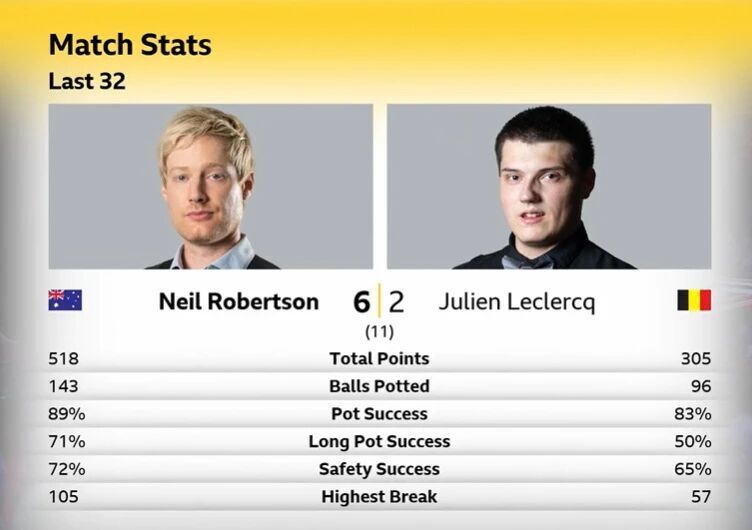 澳洲火炮罗伯逊对阵世界排名第81位的比利时球员朱利安·勒克莱尔。比赛的进程比较零碎,前7局,罗伯逊除了打出一杆破百,没有其他单杆50+的表现。罗伯逊5-2领先到赛点后,第8局,罗伯逊难度球上手,8套红黑后,红球失误,勒克莱尔没能完成单局逆转,罗伯逊6-2获胜。
