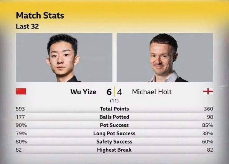 世界排名第13位的吴宜泽对阵世界排名第64位的刺客霍尔特。前面的进程非常顺利,霍尔特多有失误,吴宜泽打出3杆50+,4-0领先。前四局,霍尔特的进球只有76%,而吴宜泽是92%。感觉这比赛会像斯佳辉的比赛那样,一边倒。