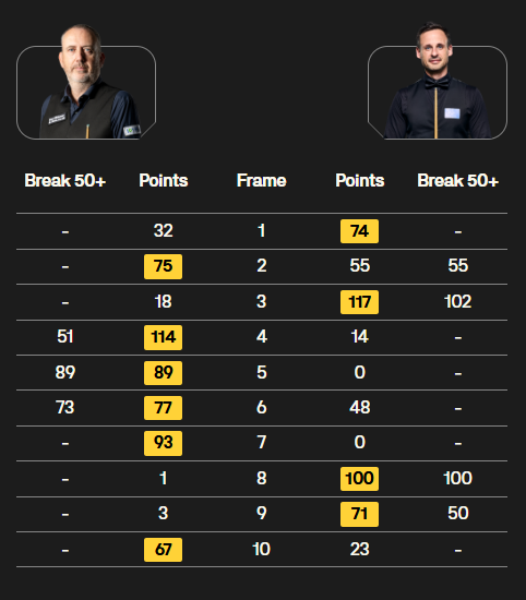 马克-威廉姆斯和土豆哥吉尔伯特的比赛,前四局,双方战平。短休后,老马连续打出两杆70+,连赢3局,5-2到赛点。绝境下的土豆哥,打出一杆破百和一杆50+,连救两赛点。