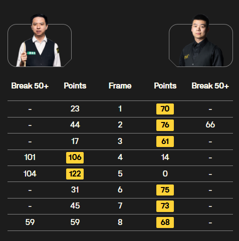 凌晨时段,上演中国德比战,肖国栋对阵庞俊旭。肖国栋上来连丢3局,第4局,肖国栋破百。短休后,肖国栋又轰一杆破百,追到2-3。第6局,庞俊旭鏖战获胜,第7局,庞俊旭缠斗获胜,5-2到赛点。