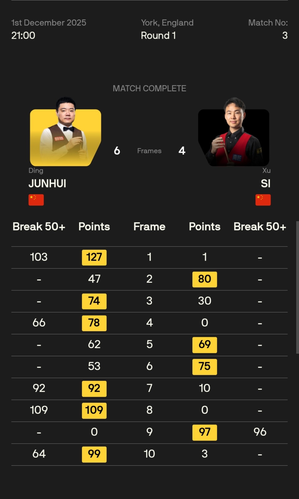本场比赛,丁俊晖全场打出103、109分两杆破百和66、92、64分三杆50+,徐思在第九局打出一杆单杆96分。