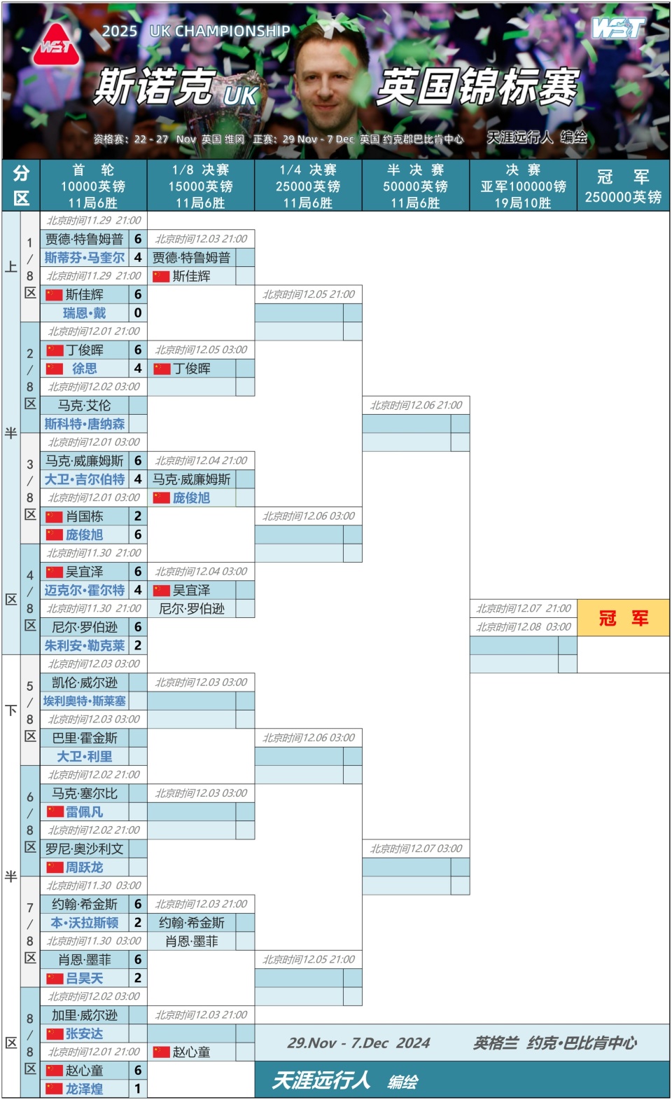 最新2025斯诺克英国锦标赛正赛进程签表,表格且称全网第二吧。一表看英锦赛正赛全程的赛程战报,各位看官老师请转发收藏,以备不时之需。