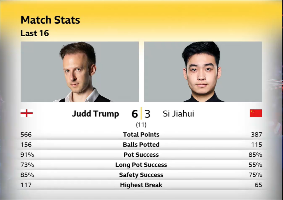凌晨时段。斯佳辉挑战世界第一的特鲁姆普。双方各赢一局后,第3局,小特破百,第4局,斯佳辉单杆65分被小特一杆65分清台、1分逆转。这局丢得痛。