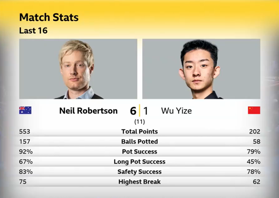晚间,世界排名第13位的吴宜泽,对阵世界排名第3位的澳洲火炮尼尔·罗伯逊。首局,吴宜泽单杆62分完成超分后,打丢锁定胜局的黑球,差一点被罗伯逊1分单局逆转。此后,吴宜泽多个失误,包括简单球失误,开始连续丢分。第4局,吴宜泽打丢单局逆转机会,罗伯逊3-1领先。前四局,吴宜泽的进球成功率是78%。