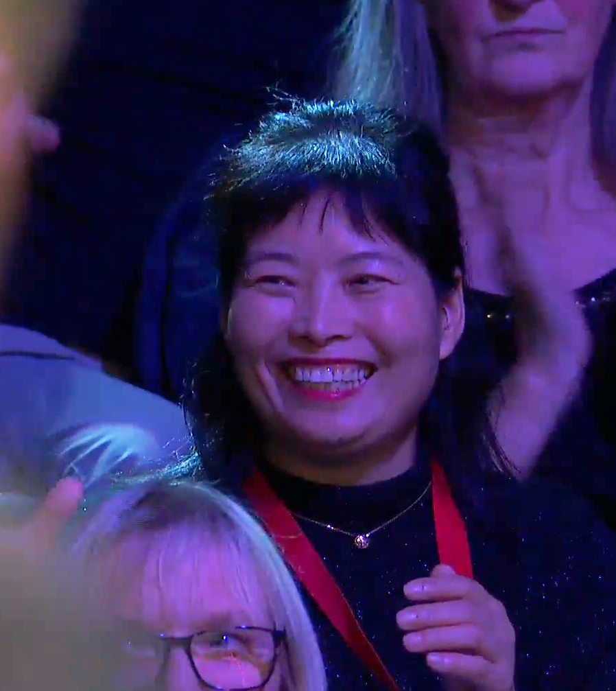 恭喜庞俊旭,首次进入英锦赛八强。观众席上,庞俊旭母亲继续近距离观战。