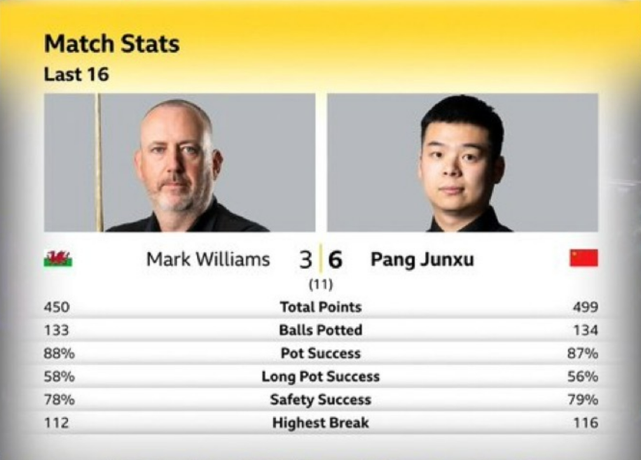 同时段,庞俊旭挑战马克·威廉姆斯。前四局,老马轰出一杆破百,庞俊旭打出一杆50+,庞俊旭3-1领先,但庞俊旭的进球成功率远低于老马,只有79%。