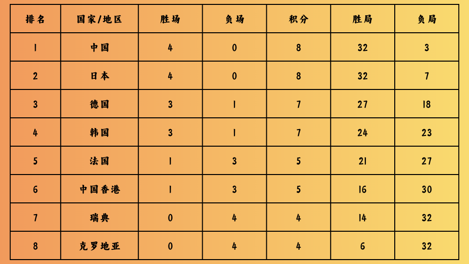此外,日本队也是4胜积8分,与法国队的比赛没打,日本队也没有锁定四强,但晋级同样是八九不离十了。韩国队与德国队目前同积7分,形势相对来说都非常不错。