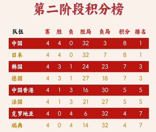 最新排名出炉:中国队第一,日本队第二,韩国队第三,德国队第四,中国香港队、法国队、克罗地亚队、瑞典队排在第五至第八。