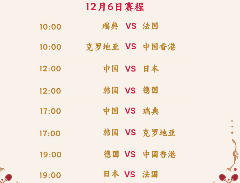 12月6日又是单日双赛模式,国乒与韩国队的赛程相对都比较紧,12点的比赛打完17点接着打。国乒将先对阵日本,拿下这场比赛就直接锁定第一。
