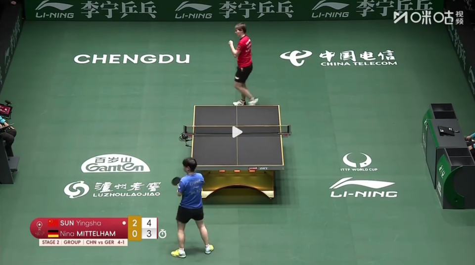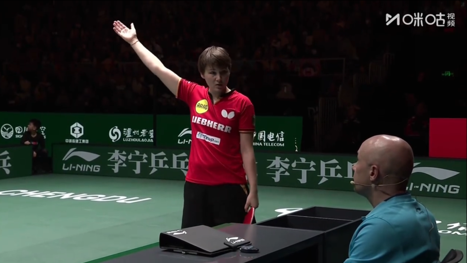 孙颖莎与米特兰姆的比赛打到第三局,孙颖莎4-3领先,孙颖莎发球,米特兰姆回球出界,比分5-3,随即米特兰姆提出孙颖莎发球擦网,