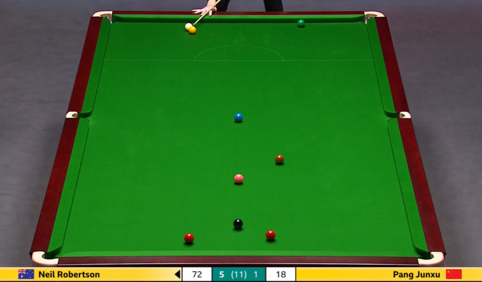 第7局,手握大把赛点的罗伯逊,单杆63分后,出现失误,但此时台面已超10分(一度超11分)。庞俊旭一杆高质量斯诺克,罗伯逊不仅罚了7分,还送上自由球,庞俊旭一杆51分清台,神奇逆转。随后,庞俊旭轰出一杆破百,连续挽救3个赛点,追到4-5。