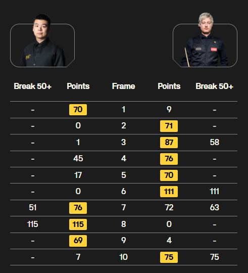 第10局,庞俊旭安全球失误,罗伯逊一杆75分制胜,6-4结束比赛。
