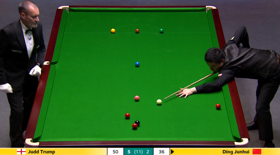 短休后,第5局,一杆制胜好机会,丁俊晖简单蓝球失误;后面多个失误,丢掉本局。第6局,小特单杆91分制胜。第7局,又是一杆制胜的绝好机会,丁俊晖简单黑球失误。特鲁姆普单局逆转,5-2到赛点。第8局,绝境下单局逆转的机会,丁俊晖简单红球失误,彻底葬送比赛。