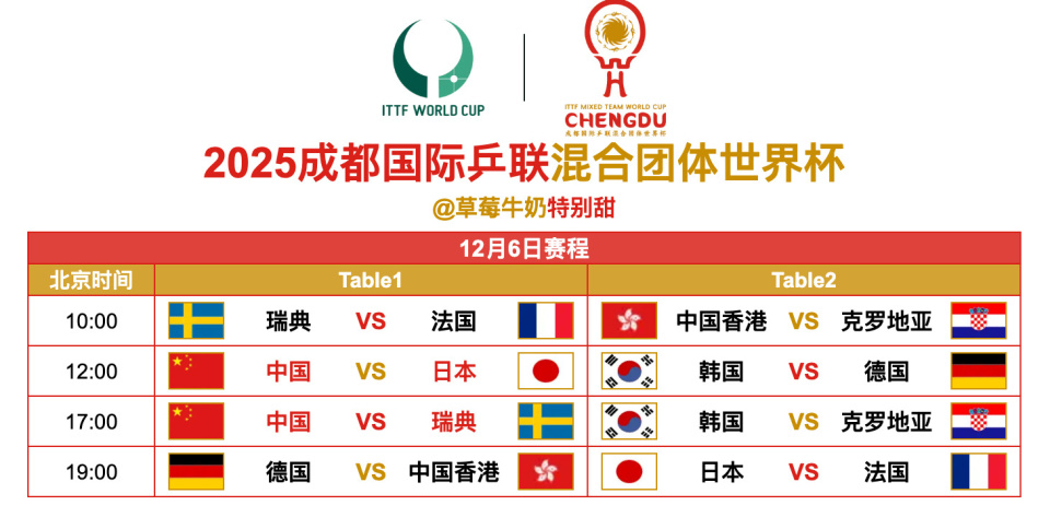 2025成都国际乒联混合团体世界杯丨12月6日全日赛程