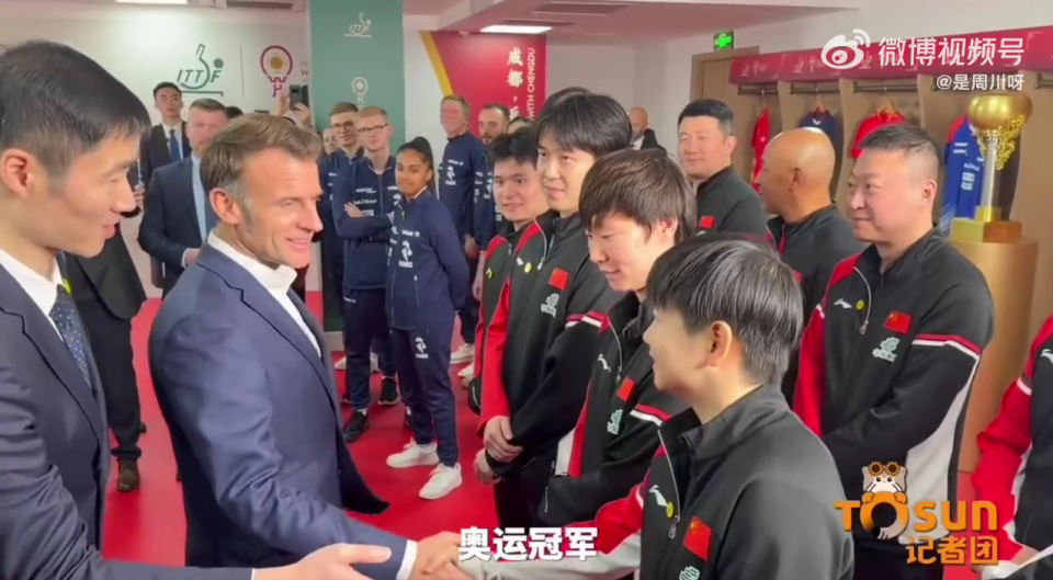中国乒协主席王励勤向马克龙依次介绍国乒的队员们,走到孙颖莎面前时,王励勤表示:“孙颖莎,奥运冠军!”